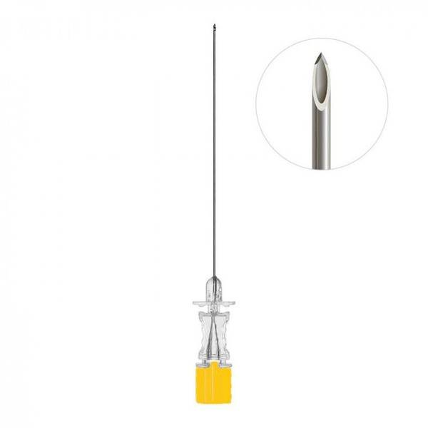 This Quincke type spinal needle (G20 x 90mm) features a pencil point design and is manufactured without a stylet. Its unique bevel, positioned close to the needle tip, creates an atraumatic cut, gently displacing rather than damaging the dura mater during spinal puncture. This significantly reduces the risk of post-dural puncture headache (PDPH). A distinct "give" sensation is felt upon penetration of the dura, and the needle's pavilion provides enhanced visualization of cerebrospinal fluid (CSF). Crafted from the finest, high-quality surgical stainless steel, this needle boasts a smooth surface for effortless and atraumatic lumbar puncture, ensuring a comfortable procedure for the patient.