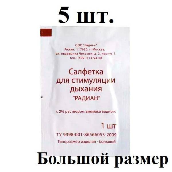 A 5-pack of Radian Breathing Stimulation Wipes (135x180mm), each individually packaged. These wipes contain ammonia and are manufactured by Radian-Med LLC, Russia (RU: FSR 2009/06146). Current shipment has an expiry date of December 1st, 2028.