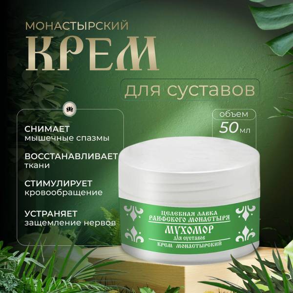 Raifsky Monastery Joint Cream provides powerful, natural relief from joint pain and inflammation. This potent anti-inflammatory balm targets back pain, leg pain, knee pain, elbow pain, hand pain, and neck pain. Formulated with a unique blend of natural ingredients, including Fly Agaric mushroom extract (known for its anti-inflammatory and healing properties), Shilajit (mumijo), and pine resin, it promotes tissue repair and reduces inflammation. Horse chestnut and Maclura extracts create a gentle warming effect, improving blood circulation to ligaments and relieving muscle spasms and nerve compression. This soothing balm is effective for sprains, bruises, and conditions such as rheumatism, arthritis, arthrosis, and osteochondrosis. Ideal for seniors experiencing age-related joint issues and athletes seeking post-workout muscle recovery, it delivers effective pain relief while improving joint mobility and flexibility. Simply apply to the affected area and massage gently until warm. Use twice daily for optimal results. 50ml.