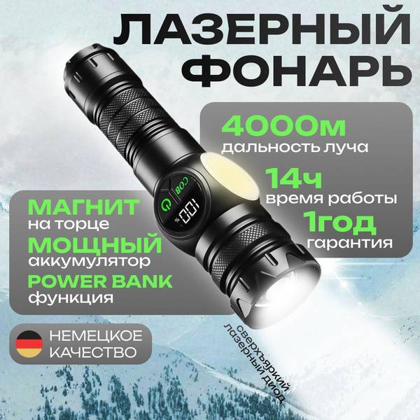 Experience the ultimate in illumination with this powerful, next-generation LED flashlight featuring a built-in laser diode. Boasting an incredibly long beam distance, this handheld flashlight offers 5 primary modes: high, medium, strobe (emergency flashing light), SOS, and a side light with 4 additional settings. A powerful magnet provides secure hands-free operation. Effortlessly adjust the zoom from 1x to 2000x with one hand – the focus is easily changed by extending the flashlight head. The focusing lens allows you to adjust the beam from a wide flood to a narrow, focused spot. Powered by an included high-capacity 26650 lithium-ion battery, conveniently rechargeable via the included Type-C cable from either a wall outlet or car charger. Constructed from durable, anodized aircraft-grade aluminum, this flashlight is waterproof and built to last. It even includes a power bank function, allowing you to charge your smartphone via the flashlight's USB port.