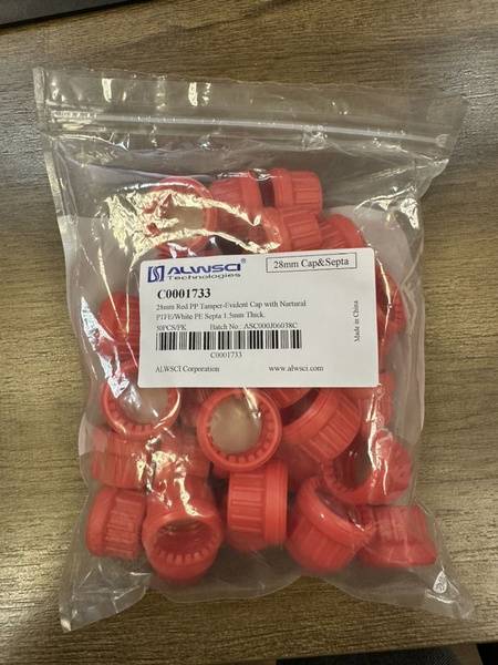 Description: These 28mm red polypropylene (PP) tamper-evident caps, featuring a 1.5mm PTFE/PE liner from ALWSCI, offer superior sealing and excellent chemical resistance to acids, alcohols, alkalis, aqueous solutions, and solvents. The integrated PTFE liner ensures a secure, leak-proof seal, preventing unauthorized access and maintaining sample integrity. Packaged 50 caps per unit.