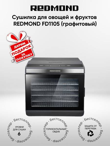 The REDMOND FD1105 food dehydrator in stylish graphite grey is a kitchen essential. This reliable dehydrator is perfect for drying fruits, vegetables, herbs, berries, mushrooms, and even making fruit leather. Powerful yet energy-efficient, it preserves maximum vitamins and nutrients, resulting in delicious and healthy snacks. Adjustable temperature settings allow you to optimize the drying process for various foods, preserving their natural flavor and aroma. Mesh trays ensure even heat distribution for quick and efficient drying. The REDMOND FD1105 electric food dehydrator is also easy to clean and maintain. Its elegant design complements any kitchen, and its compact size saves valuable counter space. The perfect choice for health-conscious individuals who want to enjoy tasty, nutritious snacks all year round. Includes a bonus gift!