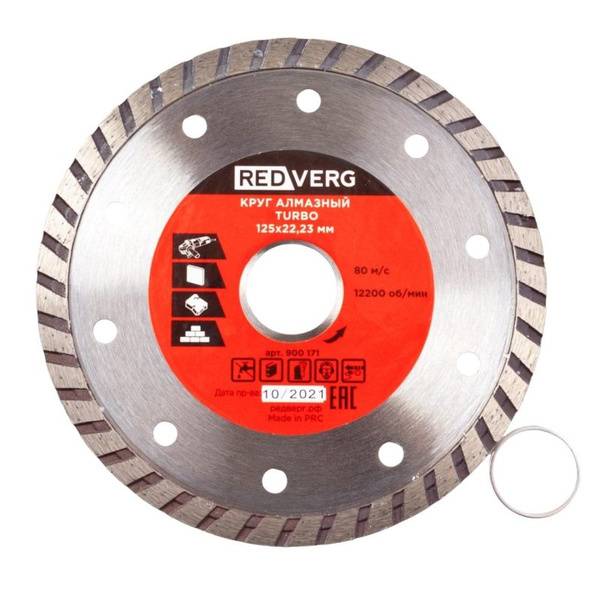 Description: High-performance RedVerg continuous diamond blade, ideal for cutting concrete and brick. This 125x22.23mm (900171) blade offers superior cutting efficiency and longevity. Please note: Product appearance and/or specifications may be subject to change by the manufacturer.