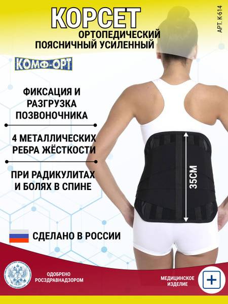 orthopedic corset, lumbar corset, back brace, back support, pain relief, lumbago, sciatica, spondylosis, radiculitis, spondylolisthesis, osteoporosis, osteochondrosis, post-operative recovery, post-traumatic injury, reinforced corset, metal stays, adjustable straps, breathable, Velcro closure, Comfort-ORT, model 614, size 6, 35cm, back pain, spinal support, medical grade corset.