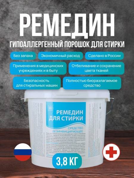 Remedin Disinfecting Laundry Powder is a high-concentration, multi-functional detergent designed for simultaneous disinfection, washing, and whitening of textiles. Effective against a broad spectrum of microorganisms, including bacteria (including tuberculosis), viruses (including Coxsackie, ECHO, polio, rotavirus, norovirus, hepatitis, HIV, influenza A H5N1 and H1N1, and adenoviruses), and pathogenic fungi (including mold). Ideal for various fabrics (cotton, linen, synthetic, and blends) and soiled items such as bedding, maternity pads, baby diapers, workwear, tableware, and cleaning cloths, even those contaminated with blood, bodily fluids, and food. Suitable for both hand and machine washing in all types of washing machines, including those with dispensing units, in various healthcare settings, including maternity and neonatal units. Remedin offers superior stain removal (including blood stains), color preservation, adjustable foam production, and is compatible with all washing machine types. It prevents scale buildup, is easily rinsed, completely biodegradable, and highly efficient, requiring only 50-70g per 5kg of dry laundry (depending on water hardness). Detailed instructions are available online.