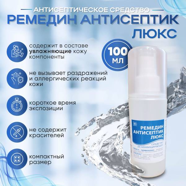 Remedin Antiseptic Luxe is a superior 100ml hand and surface disinfectant solution, providing powerful antimicrobial protection without harshness. This ready-to-use, clear, colorless liquid boasts a gentle alcohol scent and is enriched with moisturizing and skin-conditioning components for enhanced comfort compared to standard Remedin Antiseptic.