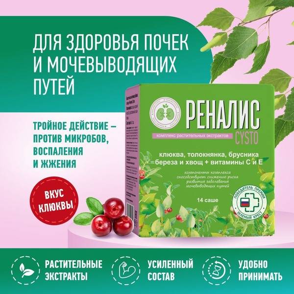 Description: Urinary tract infections (UTIs) are a common urological problem, causing discomfort, frequent urination, burning, and pain. Approximately 60% of urologist visits are related to cystitis, with an estimated 26-36 million acute cystitis cases annually in Russia. Recurring UTIs often stem from intestinal bacteria (E. coli) entering the urinary tract. Renalys Cysto offers safe and effective relief using a blend of 5 plant extracts – cranberry, lingonberry, horsetail, bearberry, and birch bark – enhanced by Vitamins C and E. This powerful combination combats inflammation, microbes, and burning sensations, while supporting urinary tract health and reducing the likelihood of recurrence. Renalys Cysto provides comprehensive support: