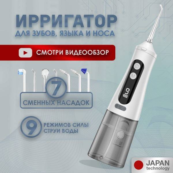 The Rennokasan Pro oral irrigator is a cutting-edge model boasting reliable electronic controls and superior quality, functionality, and design compared to competitors. This premium dental irrigator arrives in elegant packaging, including the unit itself, seven interchangeable nozzles, a convenient carrying case, and a comprehensive instruction manual. Its sleek design complements any bathroom, and its ergonomic, impact-resistant plastic body with perforated back ensures a comfortable, non-slip grip.