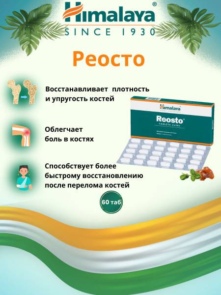 "description": "Reosto (Himalaya) utilizes phytoestrogens to slow bone resorption, preventing bone loss. Rich in natural calcium for enhanced mineral bioavailability, Reosto's balanced formula optimizes mineral absorption into bone tissue, increasing bone mass and reducing fracture risk associated with osteoporosis. Its anti-inflammatory properties also alleviate pain and swelling.",