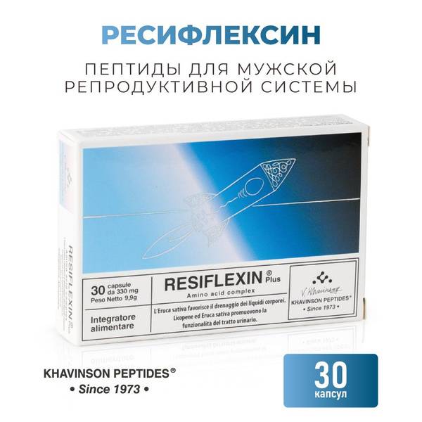 Resiflexin, Khavinson peptides, men's health, prostate health, male reproductive health, erectile dysfunction, low sperm count, prostatitis, infertility, libido, potency, peptide therapy, bioregulatory peptides, KEDP, KEDG, KE(VILON), L-arginine, Tribulus terrestris, male supplement, sexual health, anti-aging, gerontology, 30 capsules, dietary supplement.