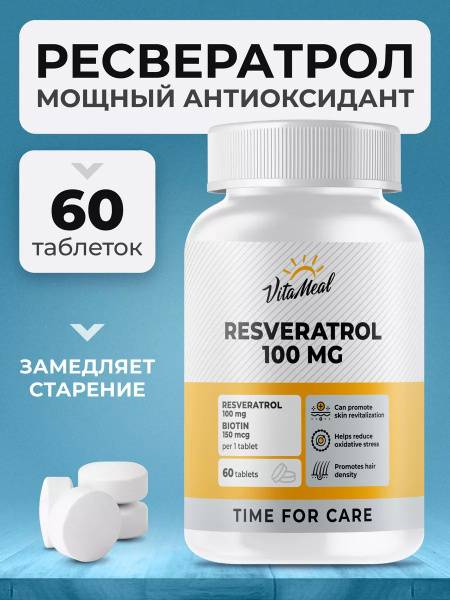Description: VitaMeal Resveratrol 100mg provides a potent dose of resveratrol from a natural Polygonum cuspidatum root extract, enhanced with Biotin (Vitamin B7). Resveratrol is a powerful antioxidant, exceeding Vitamin E in activity, known for its potential benefits in promoting healthy aging. This natural supplement supports: