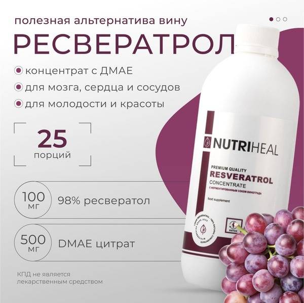 Resveratrol, DMAE, DMAE citrate, Succinic Acid, Cellular Detox, Anti-Aging, Antioxidants, Skin Rejuvenation, Cognitive Enhancement, Memory Improvement, Energy Booster, Immune Support, Nutriheal, Fermented Grape Juice, Italian Ingredients, Dietary Supplement, Anti-hypoxic, Tannins.