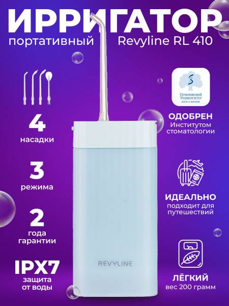 Description: The Revyline RL410 Light Blue portable water flosser is your perfect travel companion for professional oral hygiene, wherever you go. This compact model features a 140ml retractable reservoir and 3 cleaning modes for a thorough clean. Charge it conveniently via USB Type-C in just 4 hours. Modes include: Daily Clean (ideal for removing food particles and plaque, including periodontal pockets with the optional periodontal tip), Pulse (for gentle gum massage and improved circulation), and Sensitive (for users with sensitive teeth). Includes a travel case.