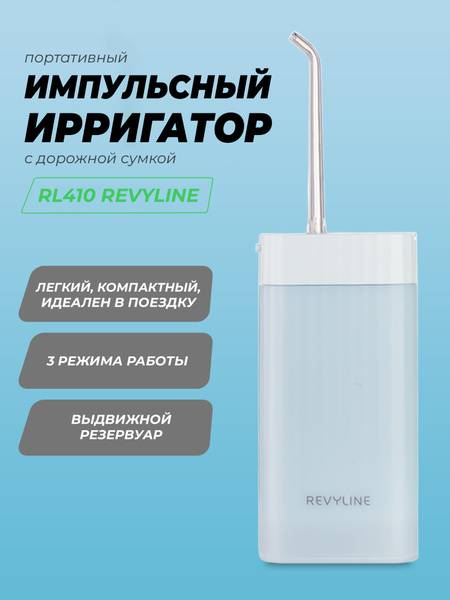 portable water flosser, travel water flosser, mini water flosser, Revyline RL410, water flosser with travel case, oral hygiene, dental hygiene, periodontal care, electric water flosser, USB-C charging, 3 cleaning modes, 140ml reservoir, impact resistant, IPX7 waterproof, tooth cleaner, plaque removal, gum massage, sensitive teeth, orthodontic water flosser, blue water flosser, portable dental care.