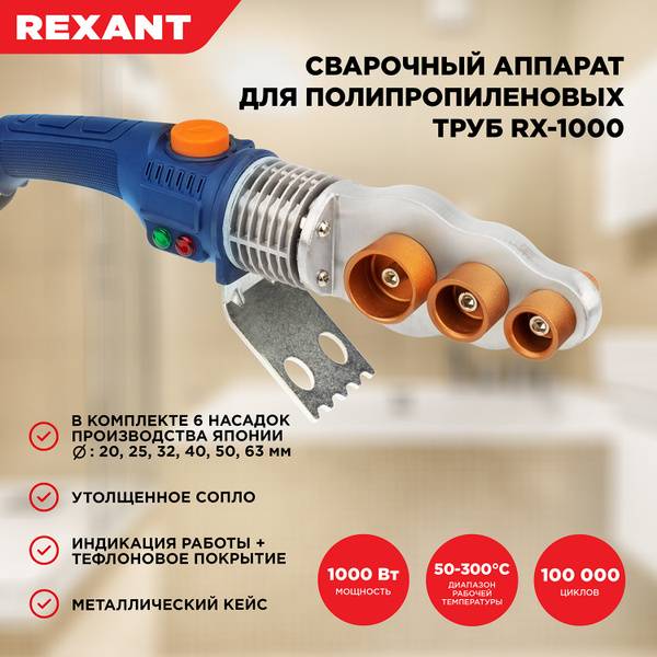 Description: The REXANT RX-1000 polypropylene pipe welding machine is a powerful and versatile tool for joining polypropylene pipes with various fittings and couplings. Ideal for both new installations and repairs, its 1000W power rating significantly speeds up the welding process. Featuring a power-on indicator and mode selection, the ergonomic, non-slip handle ensures a secure and comfortable grip. A precise temperature regulator (thermostat) allows you to select the ideal working temperature between 50°C and 300°C. Boasting a lifespan exceeding 100,000 cycles, this 220V tool includes a convenient stand for enhanced usability. Six high-quality, Japanese-made nozzles (20, 25, 32, 40, 50, and 63 mm) are coated with double Teflon for superior non-stick performance, eliminating material buildup. Butt-fusion welding eliminates the need for adapters or additional accessories. Supplied in a robust metal carrying case for easy transport and storage, the professional-grade REXANT RX-1000 guarantees high-quality results even under demanding conditions.