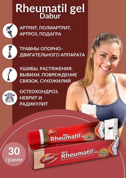 Dabur Rheumatil Gel offers effective Ayurvedic relief from joint and muscle pain, inflammation, and swelling. This potent gel provides fast-acting relief from arthritis, osteoarthritis, and osteochondrosis. Formulated with over 50 medicinal herbs, including the unique Mahanarayana oil, Rheumatil Gel effectively warms the affected area, alleviates pain, and promotes the repair of damaged connective tissue. Natural vitamins A, E, and D3, along with essential minerals, work at a cellular level to normalize redox processes in inflamed tissues and improve calcium metabolism, reducing calcium deposits (osteophytes). The inclusion of Guggul (a potent herbal resin) enhances the penetration and absorption of active ingredients into affected joints and muscles, providing powerful anti-rheumatic and analgesic effects. Clinically tested at the Institute of Rheumatology of the Russian Academy of Medical Sciences, Rheumatil Gel is recommended for widespread use in patients with inflammatory and degenerative-dystrophic diseases of the joints and spine. Studies show significant reduction in swelling, pain, and improved warmth within the first day, with consistent pain relief (both at rest and during movement) achieved within two weeks. Free from side effects, regular use of Rheumatil Gel can help restore mobility and improve quality of life. For enhanced results, consider combining with Yogaraj Guggul (2 tablets, 3 times daily before meals). Rheumatil Gel is compatible with traditional treatments and may allow for a reduction or elimination of NSAIDs when used concurrently.