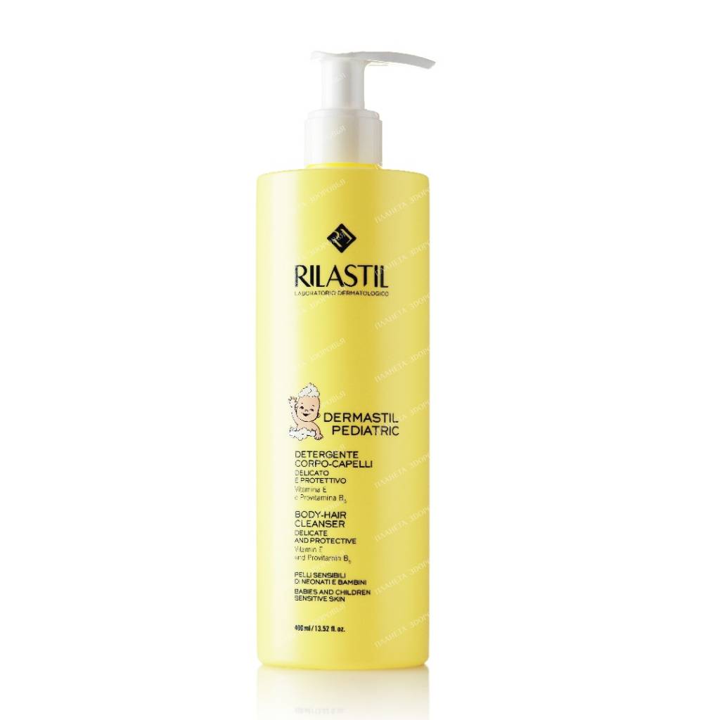 Keywords: Rilastil DERMASTIL PEDIATRIC, baby shampoo, baby wash, baby skincare, gentle cleanser, tear-free, pH neutral, omega 3, omega 6, omega 9, pro-vitamin B5, vitamin E, stearyl glycyrrhetinate, sensitive skin, diaper rash, dermatosis, baby bath, daily cleansing, baby products, children's skincare, hypoallergenic, safe for babies, 400 ml, Rilastil, DERMASTIL,