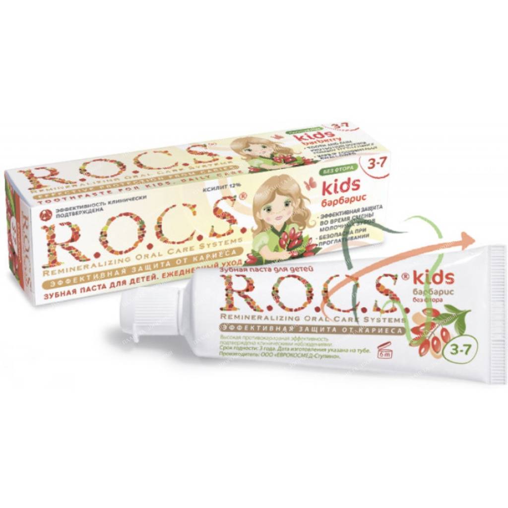 Keywords: ROCS Kids Toothpaste, fluoride-free toothpaste, children's toothpaste, 3-7 years old, barberry flavor, caries protection, enamel strengthening, prebiotic, low abrasive, gentle on teeth, dental health, oral hygiene, fluoride sensitivity, clinically proven, buy now, online shopping.
