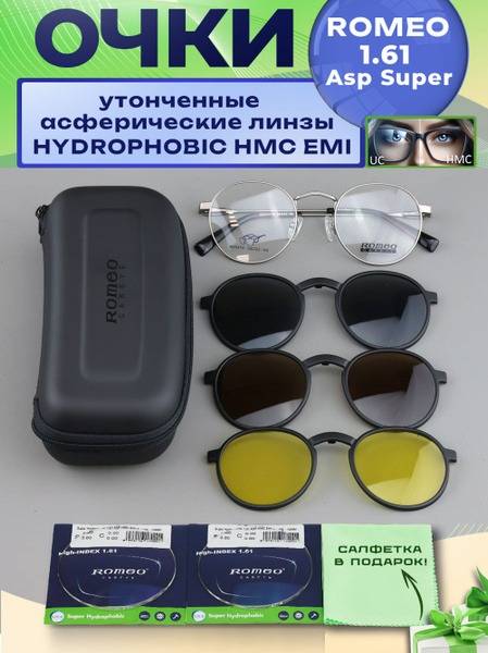 Experience superior vision with the Romeo 3-in-1 magnetic clip-on eyeglasses (Model R25474, Color 4). These stylish frames feature high-quality, aspheric Romeo 1.61 ASP Super Hydrophobic HMC/EMI lenses (-1.25, PD 58-60) crafted with precision by Essilor, a leading French manufacturer. The lightweight (20g) and durable plastic frame incorporates innovative clip-on technology, allowing for effortless magnetic attachment and removal of two included polarized sunglass clips (black and brown) and a dedicated driving clip.