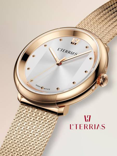Indulge in the exquisite craftsmanship of the L'TERRIAS women's watch. This sophisticated timepiece seamlessly blends minimalist design with premium materials and Swiss-made precision. The Rose Gold PVD-coated stainless steel case (316L) is meticulously finished with polished and linear brushing, showcasing the brand's commitment to detail. Two sparkling cubic zirconia stones flank the conical crown, a signature design element of the L'TERRIAS collection.
