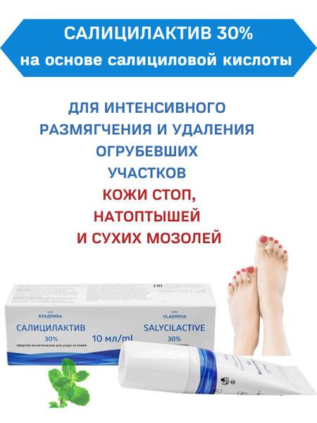 Description: Vladmiva Salicyl-Active 30% is your go-to solution for soft, revitalized feet. This cream effectively softens and removes calluses, corns, and hardened skin. Formulated with petrolatum, salicylic acid, and peppermint oil for optimal efficacy and a refreshing feel. 10g.