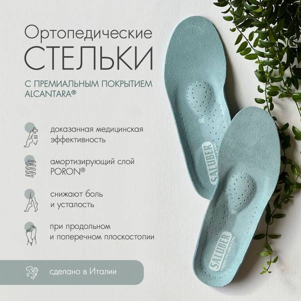 Experience superior comfort and support with Saluber orthopedic insoles, crafted in Italy. These high-quality insoles feature a soft, durable Alcantara microfiber top cover and are designed for comfortable, roomy footwear like sneakers and athletic shoes. The innovative PORON® anti-shock heel insert cushions impact, absorbs shock, and reduces pressure on the heel. A full-length PORON® cushioning layer provides even weight distribution, promoting pain-free movement. Arch supports for both longitudinal and transverse arches, combined with a stabilizing frame, ensure proper biomechanics.