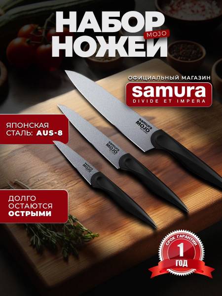 Samura Mojo, kitchen knives, knife set, AUS-8 steel, Japanese steel, chef's knife, utility knife, paring knife, black handle knives, full tang knives, durable knives, kitchen tools, cooking knives, gift ideas, best kitchen knives, premium knives, dishwasher safe knives, ergonomic knives, home cooking, outdoor cooking, picnicking, camping, men's gift, women's gift, birthday gift, holiday gift, sale, discount.