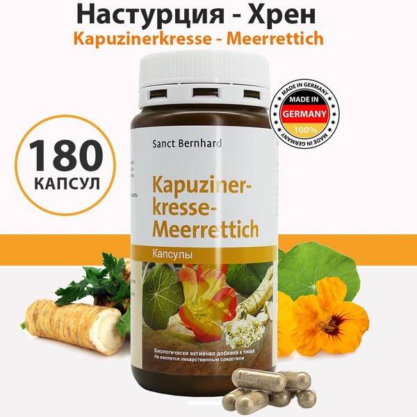 Boost your immunity and energy with Sanct Bernhard's Nasturtium & Horseradish supplement! This unique dietary supplement combines the potent natural power of nasturtium and horseradish in a convenient capsule form for a 20-day course. Experience the difference of a natural approach to well-being.