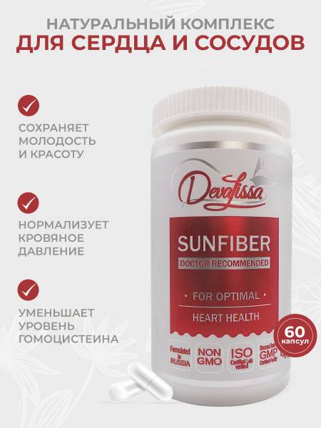 Sunfiber, DevaLissa, heart health, cardiovascular health, blood pressure, cholesterol, hypertension, arrhythmia, atherosclerosis, stroke, diabetes, supplements, vitamins, minerals, CoQ10, magnesium, potassium, taurine, succinic acid, antioxidant, antihypoxic, blood vessel elasticity, capillary fragility, dietary supplement, healthy lifestyle, heart support, vascular support, premium supplement.