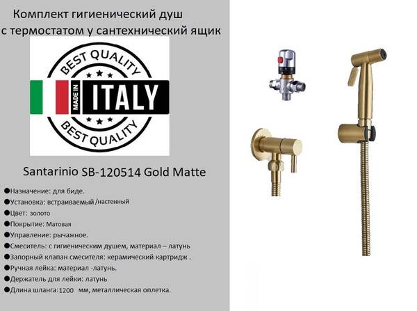Indulge in luxurious showering with the Santarino Gold Matte Shower System. This elegant set features a thermostatic mixer with an angular valve, ensuring precise temperature control and a consistent, comfortable showering experience. Crafted from durable brass, the system boasts a stunning matte gold finish that adds a touch of sophistication to any bathroom. The 120cm long shower hose provides ample reach, while the concealed thermostatic mixer installation maintains a clean, modern aesthetic. Benefit from our comprehensive warranty: 60 months on the brass body (excluding cracks), 60 months on chrome finishes, and 12 months on colored finishes (including gold, black, white, bronze, and satin). Warranty periods vary for stainless steel mixers and components. (Specific warranty details for commercial/industrial use available upon request).