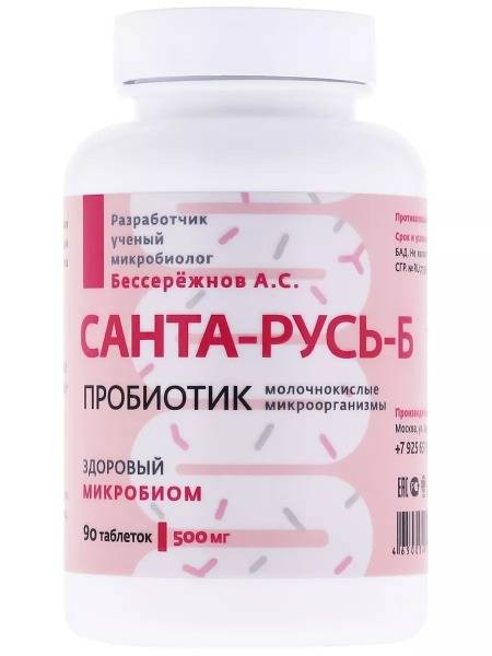 Santa Rus B, Besserezhnov, probiotic, dysbiosis, gut health, immune support, liver support, digestive health, bifidobacteria, lactobacilli, propionic acid bacteria, weight management, anti-aging, functional gastrointestinal disorders, inflammatory bowel disease, immune deficiency, RAMS approved, probiotic supplement, 90 tablets, 500mg