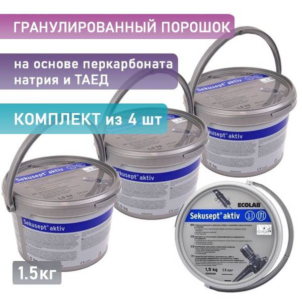 Keywords: Sekusept Aktiv, disinfectant powder, sodium perborate, TAED, broad-spectrum disinfectant, high-level disinfection, sterilization, pre-sterilization cleaning, medical instruments, surface disinfection, virus, bacteria, fungi, sporicidal, hospital disinfectant, healthcare disinfectant, cleaning, decontamination, Mycobacterium terrae, tuberculosis, plague, cholera, tularemia, anthrax, HIV, influenza, H1N1, H5N1, Candida, dermatophytes, endoscope disinfection, 1.5 kg, 4 pack.