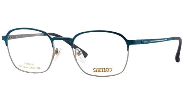 "description": "Experience unparalleled comfort and style with the Seiko T9060-005 men's titanium eyeglasses. These lightweight, durable frames boast a classic square design in a sophisticated matte blue finish. Crafted from 100% pure titanium, they are hypoallergenic, biocompatible (used in surgical implants), and significantly lighter and stronger than stainless steel or aluminum. The unique temple design features a striking wheel-inspired accent and a white stripe, complemented by a flexible "flex" mechanism for enhanced durability and a perfect fit. Weighing only 17 grams, these frames offer exceptional comfort all day long. Adjustable nose pads and temple tips ensure a personalized fit. The nickel-free construction makes them ideal for those with nickel allergies. Includes a Seiko case and a 1-year warranty. Frame width: 145mm (inner measurement).",