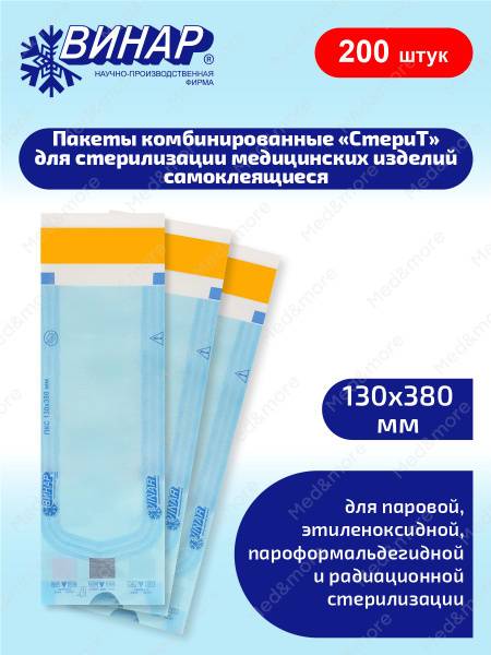 SteriT self-adhesive combination pouches (130x380 mm, 200 pcs) are designed for steam, ethylene oxide, formaldehyde, and radiation sterilization. These pouches offer superior permeability to sterilizing agents while maintaining a hermetic seal to prevent microbial contamination. Their integrity remains intact after sterilization, conforming to ГОСТ ISO 11607-2011 and EN 868 standards. Class 1 process indicators (steam, formaldehyde, EO) are printed on the paper side, clearly differentiating sterilized from unsterilized items. A wide range of sizes is available.