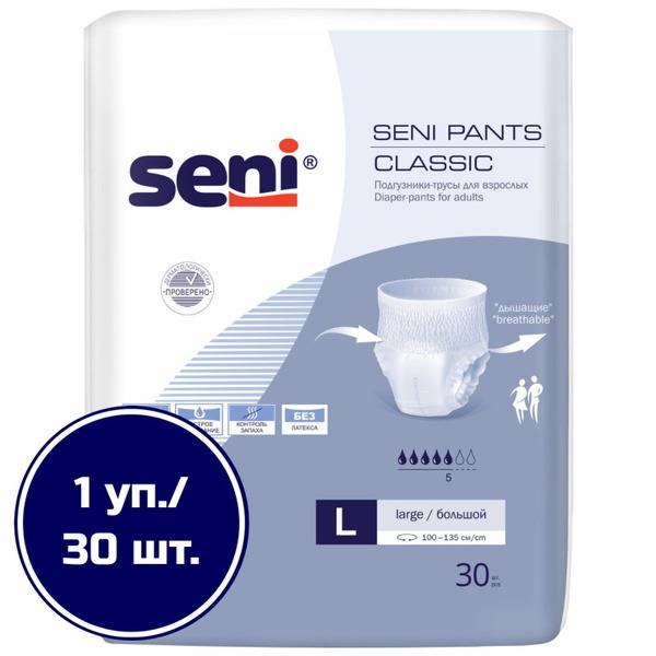 Seni Classic Adult Pants offer reliable incontinence protection for both men and women. With a 5-drop absorbency rating, these soft, elastic pants quickly absorb fluids and neutralize odors, providing discreet and comfortable wear. Designed for active lifestyles, they're easy to put on and take off like regular underwear, offering a comfortable, unrestricted fit.