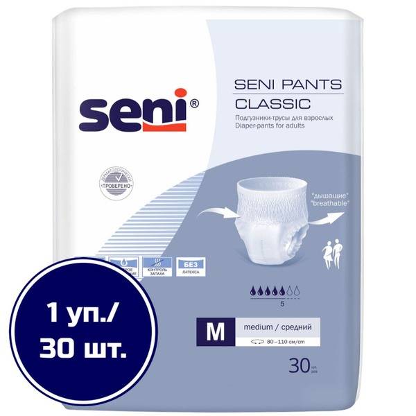 Experience superior comfort and protection with Seni Pants Classic adult diapers, size M (30 count). Designed for both men and women, these pants provide reliable absorbency for everyday needs. Featuring a high 5-drop absorbency rating, they quickly and effectively absorb fluids, neutralizing odors to keep you feeling fresh and confident all day long.