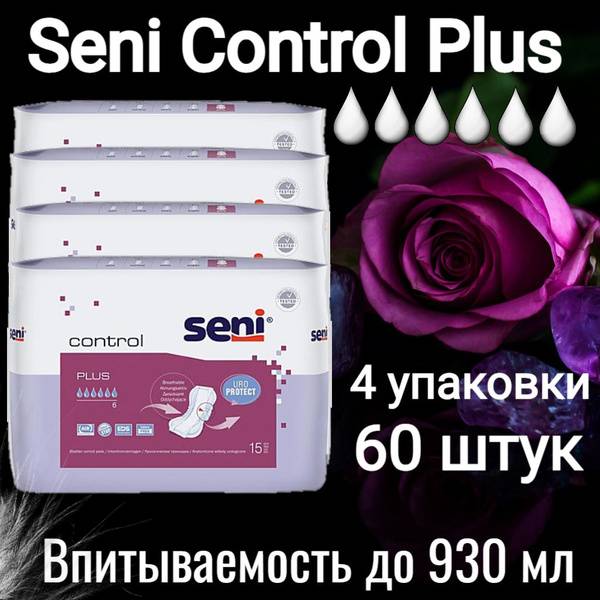 Keywords: Seni Control Plus, incontinence pads, women's incontinence pads, bladder weakness, heavy absorbency, overnight incontinence pads, travel incontinence pads, Seni Lady Plus, incontinence supplies, adult diapers, bladder control, absorbent pads, leak protection, discreet protection, comfortable incontinence pads, latex-free, 930ml absorbency, 60 count, 4 packs, non-woven, super absorbent, anatomical shape, hydrophobic barriers, EDS system.