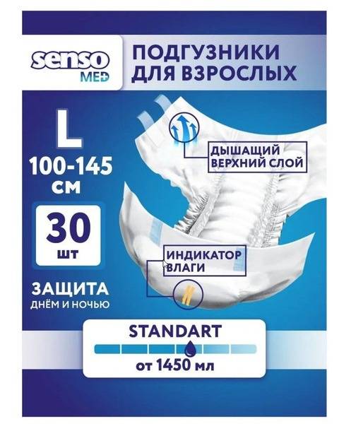 Senso Med Standard adult diapers provide superior comfort and protection for immobile or bedridden individuals. They feature a multi-layered absorption core that locks away odors and handles high fluid volumes. The elastic waistband and refastenable tapes ensure reliable leak protection and easy use. This pack contains 30 diapers, size Large (100-150cm waist).
