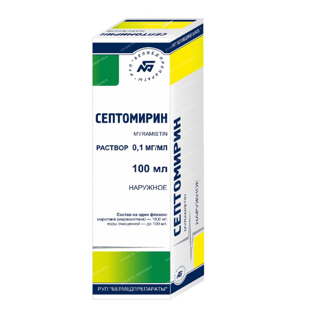 Septomyrin solution for external use 0.1 mg/ml 100 ml is a powerful antiseptic that effectively combats a wide range of bacteria, fungi, and viruses. This broad-spectrum solution is ideal for treating various infections and preventing complications in a variety of medical situations.