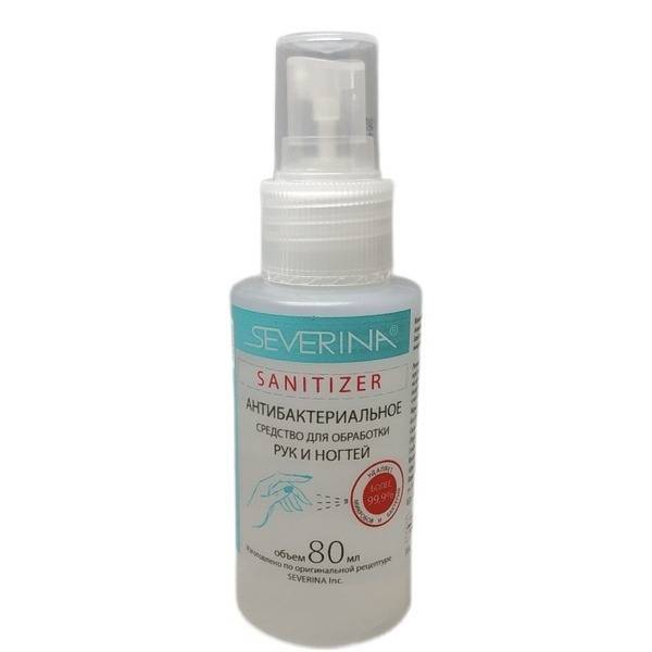 Severina Sanitizer, antibacterial sanitizer, hand sanitizer, nail sanitizer, disinfectant spray, manicure disinfectant, pedicure disinfectant, salon disinfectant, tools disinfectant, UV lamp disinfectant, paraffin bath disinfectant, triclosan, glycerin, propylene glycol, mint extract, sage extract, antifungal, antiviral, moisturizing, 80ml, spray bottle, professional sanitizer, beauty salon supplies, nail salon supplies.