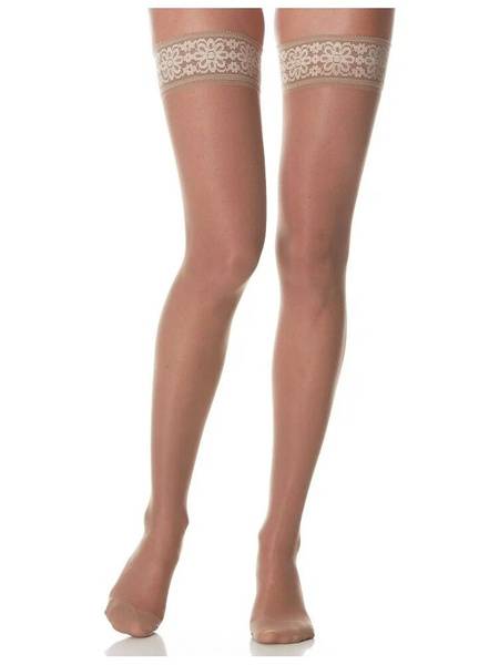 Experience the superior comfort and support of Ergoforma Class 2 compression stockings. These sheer beige stockings offer a 20-30 mmHg (Class 2) graduated compression that gently promotes healthy venous circulation. The compression is highest at the ankle (100%) gradually decreasing to 70% below the knee and 40% at the thigh. This graduated compression helps to: