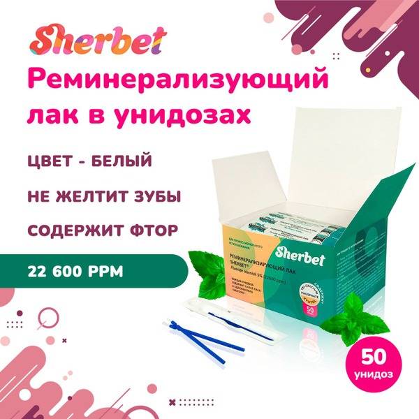 remineralizing fluoride varnish, tooth sensitivity, desensitizing varnish, fluoride varnish, sodium fluoride, tricalcium phosphate, xylitol, peppermint, single-dose, dental varnish, professional use, hypersensitivity, exposed dentin, root sensitivity, remineralization, tooth pain relief, dental treatment, preventive dentistry, Sherbet.