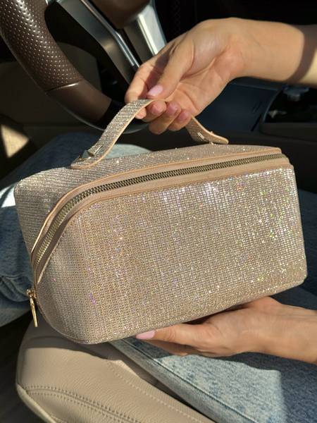 This elegant shimmering beige cosmetic bag is the perfect blend of style and functionality for both travel and everyday use. Crafted from a high-quality, lurex-like fabric, its subtle shimmer adds a touch of glamour to your beauty routine. Unlike other bags with potentially flaky glitter, the sparkle is woven directly into the fabric, ensuring lasting beauty and a smooth, luxurious feel.