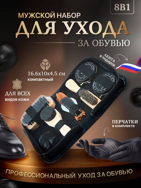 Description: This comprehensive shoe and clothing care kit is the ultimate solution for maintaining your footwear and apparel. The kit includes: black and white (neutral) shoe cream for nourishing and protecting leather shoes, restoring their shine and color while offering effective water and reagent protection. Suitable for all types of natural and artificial leather, excluding suede, nubuck, and velour. Two high-quality brushes—one with stiff bristles for deep cleaning and one with soft bristles for polishing and delicate fabrics. The stiff brush effectively removes dirt, hair, and debris from shoes and clothing, while the soft brush is ideal for applying cream and polishing leather. A durable wooden-handled sponge for easy cream application and cleaning. A microfiber cleaning cloth with two sides: one for cleaning and the other for polishing, effectively cleaning all types of shoe materials including leather, suede, nubuck, and velour, without staining hands. A compact, stylish metal shoehorn for easy and comfortable shoe insertion, ideal for travel and everyday use. A pair of nitrile gloves for protecting your hands during cleaning. All items are neatly stored in a sleek, black carrying case (16.5x10x4.5 cm), perfect for home use, travel, or gifting. This versatile kit is perfect for cleaning a wide array of materials and makes a thoughtful gift for any occasion.