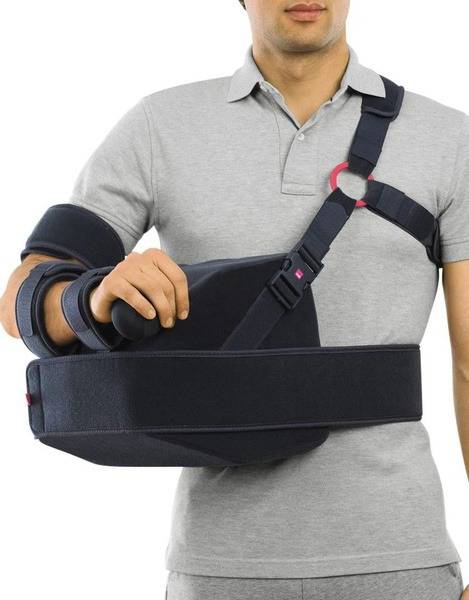 The anatomically shaped pad abducts the shoulder, thereby unloading the glenoid labrum. The controlled abduction angle (30° or 45°) prevents adhesion formation (adhesive capsulitis). Additional shoulder stabilization is provided by a special strap, allowing for early active and passive mobilization of the elbow and wrist. This enables early functional treatment and the commencement of physiotherapy.