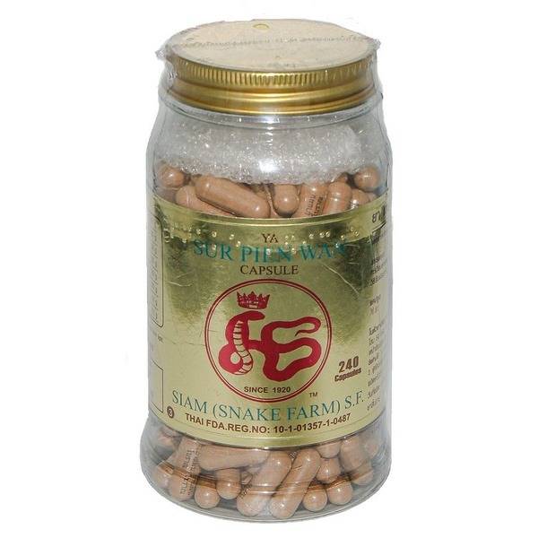 Ya Sur Pien Wan (Sur Prieng Wang) from Siam Snake Farm is a potent herbal supplement designed to restore sexual function, enhance potency, and improve overall men's urinary and reproductive health. This formulation, packaged in a gold-colored container (240 capsules), is specifically designed for the domestic Thai market. It contains snake extracts (including snake bone and genitalia), along with potent extracts of renowned Chinese and Thai medicinal herbs such as Reishi mushroom, Ginseng, and Swallow nests. Ya Sur Pien Wan acts as a potent hepatoprotector and antioxidant, and is particularly beneficial in addressing male infertility, prostatitis, and other urinary tract infections. It also offers preventative benefits against various male reproductive health issues.