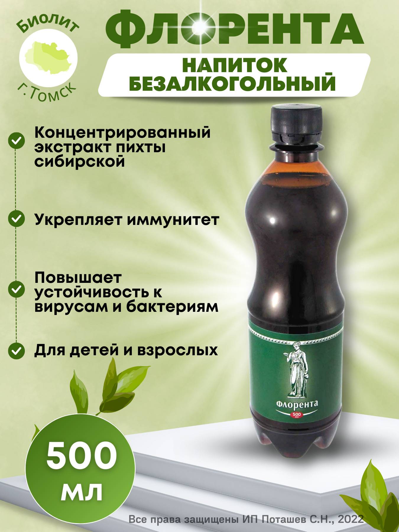 Keywords: Florenta, Siberian fir extract, adaptogen, antiviral, anti-inflammatory, immune support, cardiovascular health, digestive health, wound healing, fatigue, chronic fatigue syndrome, infections, respiratory infections, post-treatment recovery, chemotherapy, radiotherapy, alcohol withdrawal, ARGO Biolit, Tomsk, 500ml.