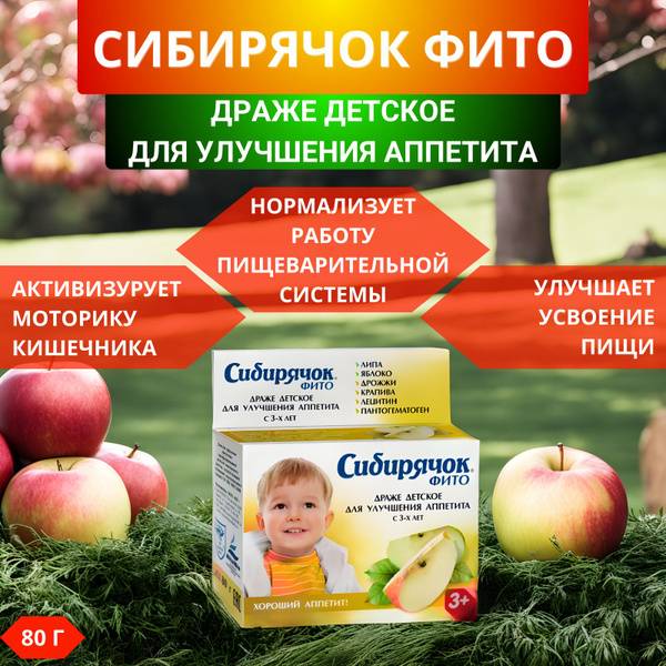 Sibiryachok Phyto, developed by YUG company, carries on this tradition using the natural bounty of the Altai region. These delicious dragees are recommended as a dietary supplement for children aged 3 and older to improve appetite and serve as an additional source of Vitamin C.