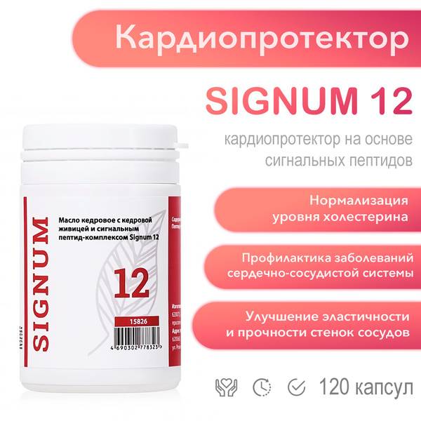 - Signum 12 Peptide Complex: Provides tissue-specific regulatory action on cardiovascular system cells, normalizing metabolism and restoring the synthesis of essential proteins and hormones. This helps restore function to physiologically optimal levels, preventing the development of pathological conditions.