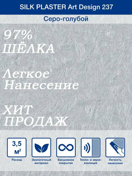 Art Design's popular 237 collection graces 5-star hotels worldwide. This stylish choice, favored by designers, features uniquely sophisticated, yet impactful, muted tones. The luxurious silk texture adds elegance and refinement to any interior. Eco-friendly (Class A+). Easy application—perfect even for pet owners! This light grey-blue shade and pleasing texture are ideal for bedrooms, living rooms, studies, or offices. Art Design 237 complements both light and dark flooring and furniture, harmonizing beautifully with cool-toned wood and stone. Application is simple: just mix the dry powder with water (as per instructions), let it rest for 12 hours, and apply with a plastic trowel. For optimal results, use Silk Plaster primer: it creates a moisture-resistant barrier, evens wall color, and its quartz sand provides a textured surface for easier application.